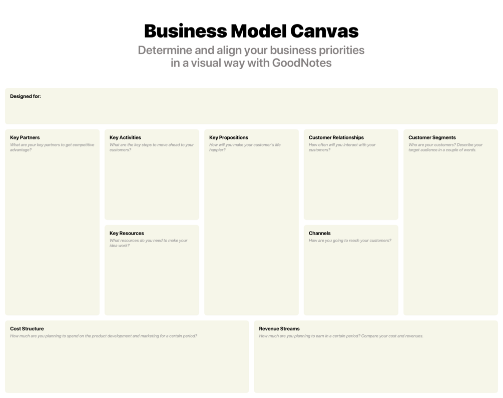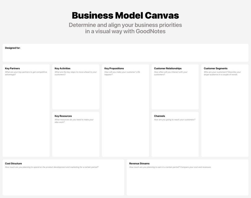 The Business Model Canvas template prepared special for your GoodNotes App and designed by Alexander Osterwalder and Yves Pigneur, provides a strategic and powerful way to understand and plan your business. Collaborate with your team to find a better way to explain your business.